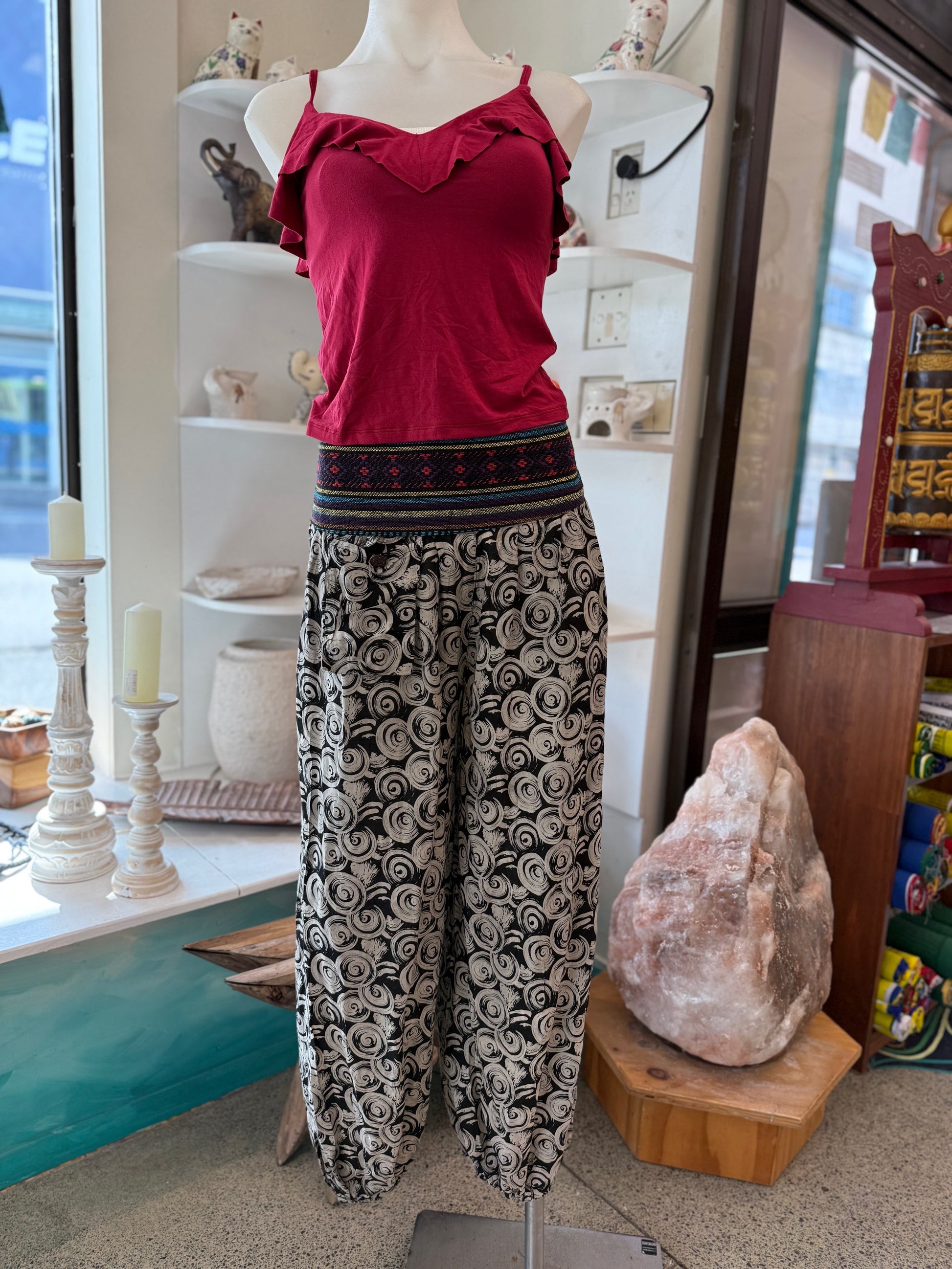 Available in a variety of artistic prints – from bold spirals to organic leaf-inspired designs – these pants bring a touch of creativity to your wardrobe. The elastic cuffs at the ankles make them versatile to wear with sandals, sneakers, or barefoot on the beach.