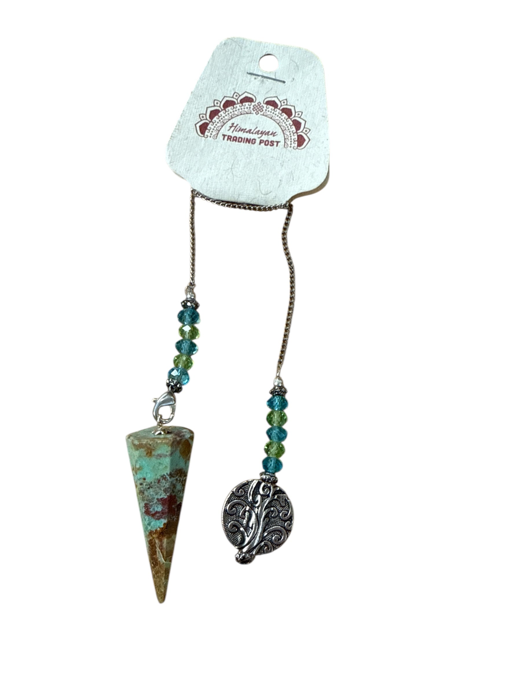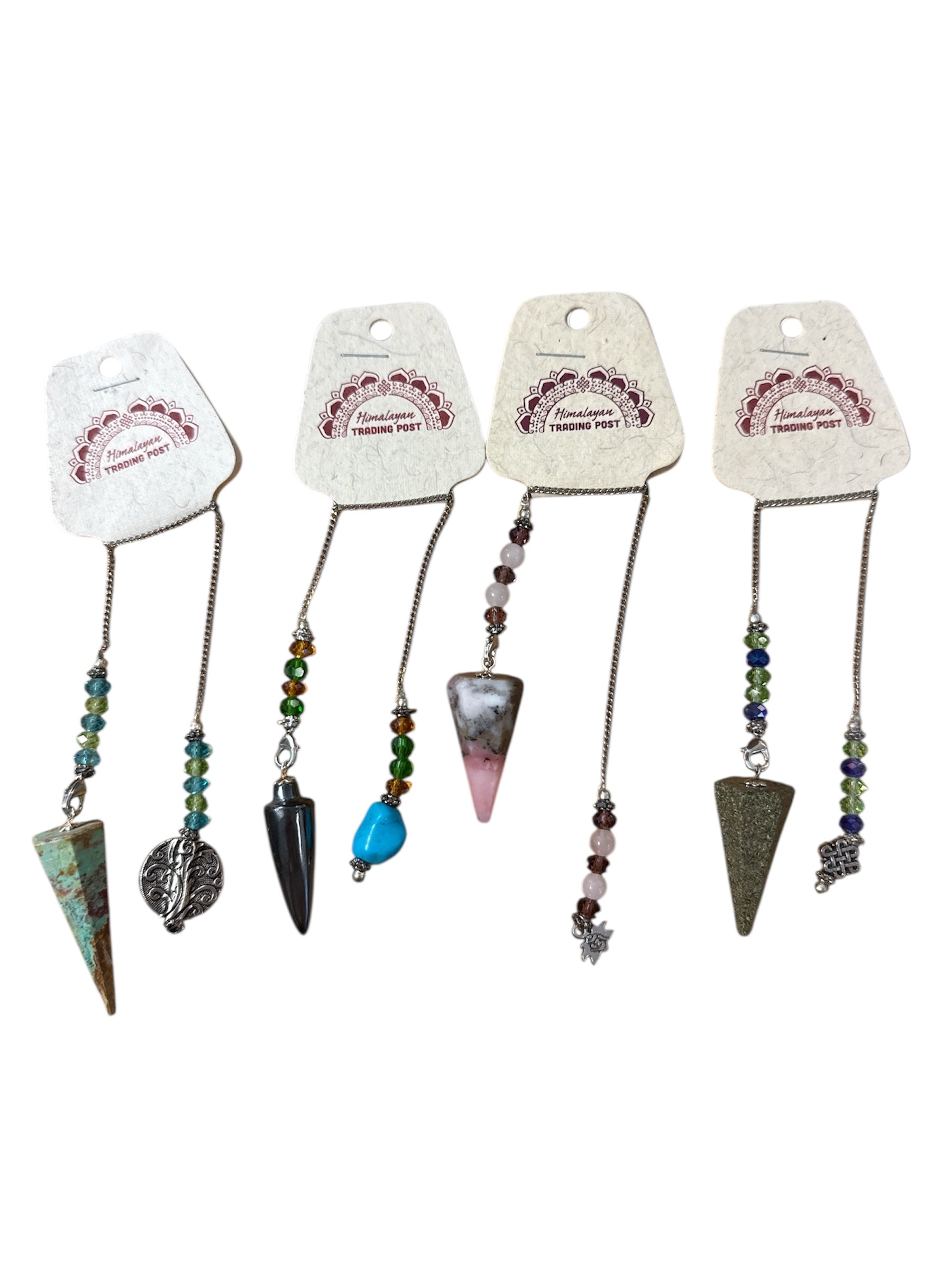 L:28cm This polished faceted pendulum has contrasting beads and a charm on the end