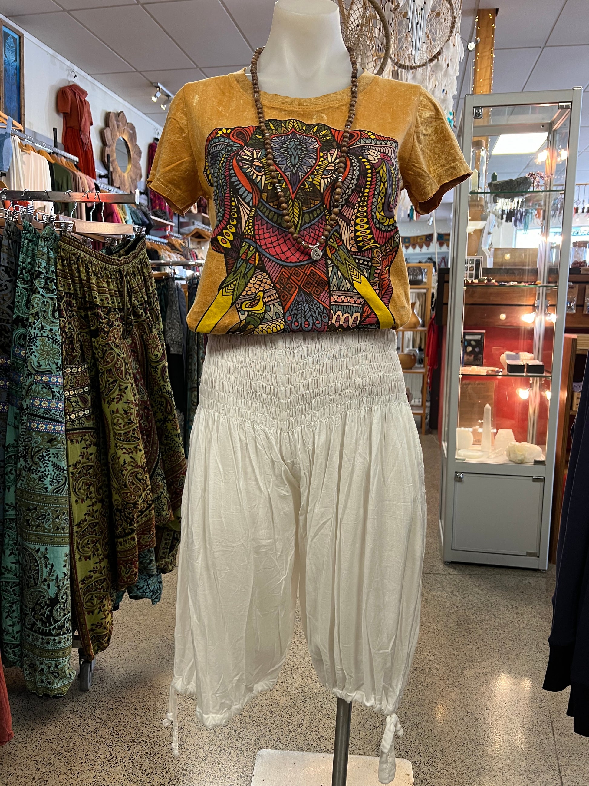 Comfortable smock top, secret pockets, drawstring cuffs: the must have short summer pants. Although, why not wear them in winter with leggings or tights and boots?