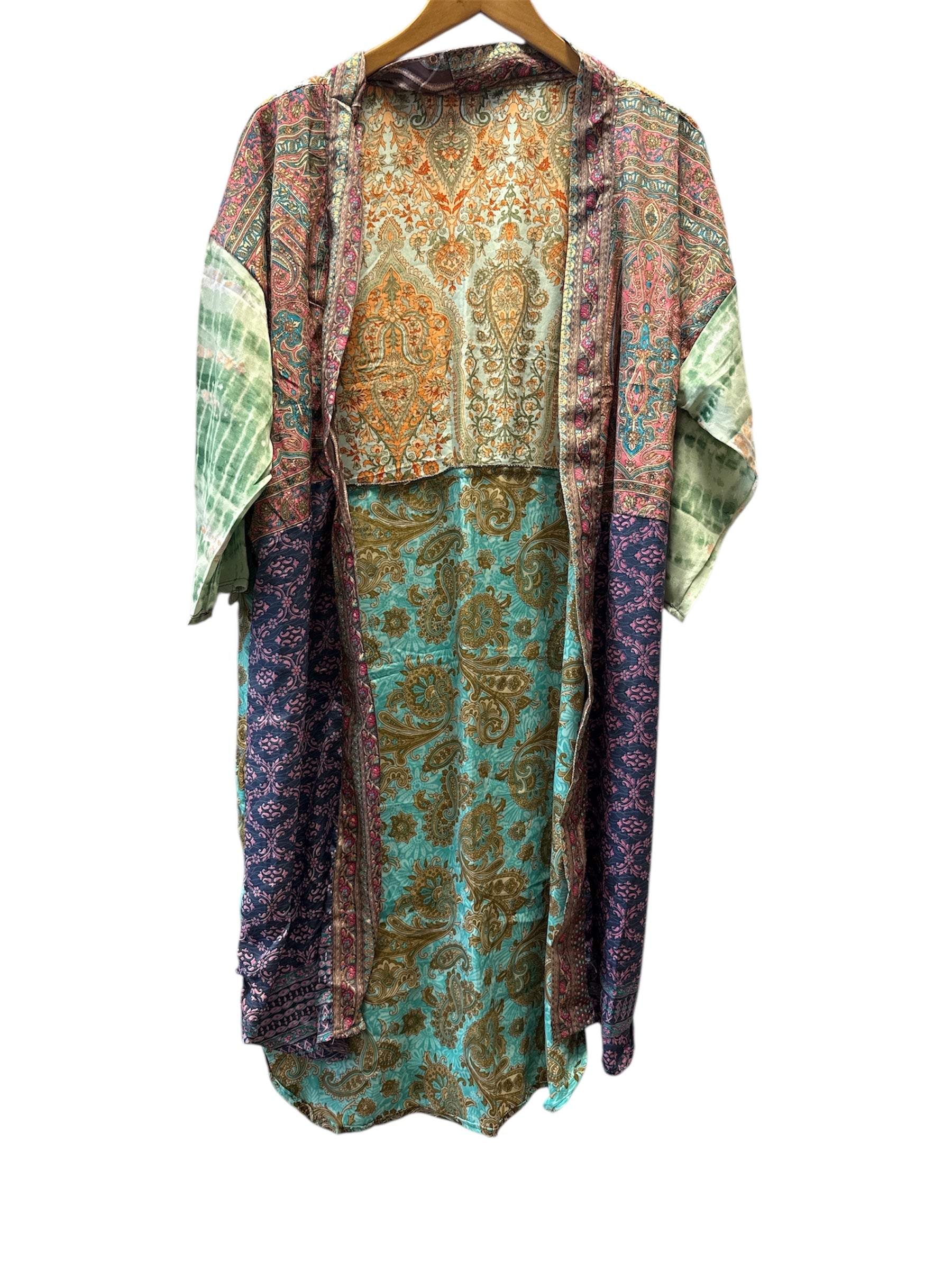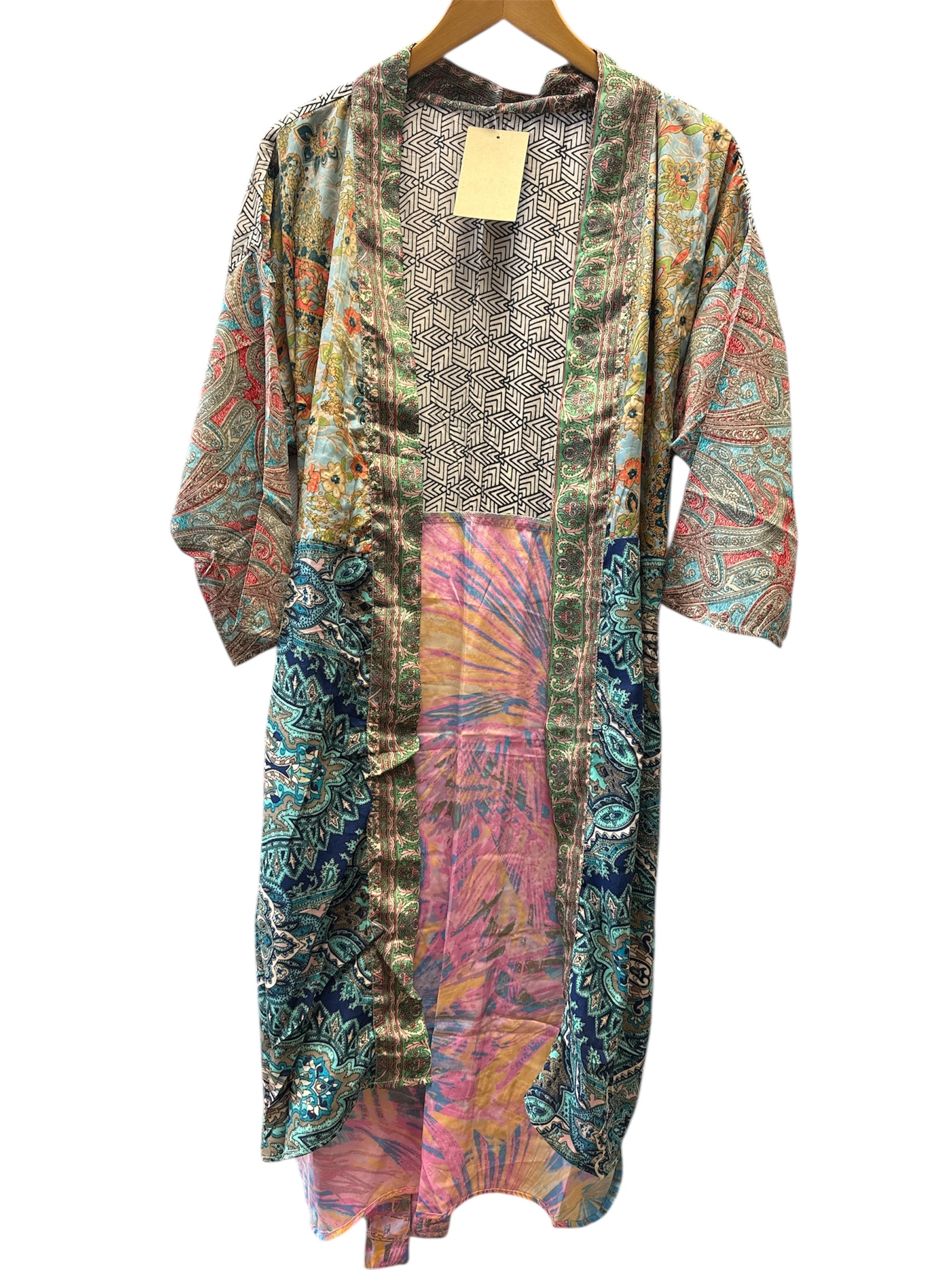 Wrap yourself in colour and creativity with this stunning bohemian kimono. crafted from a mix of vibrant block-printed fabrics, this piece features a patchwork of floral, paisley, and geometric design. Each panel tells its own story, creating a beautiful eclectic look that's both elegant and free-spirited.